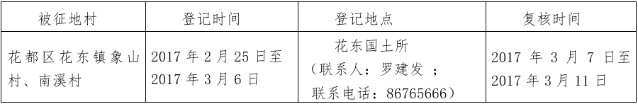 五、被征收土地四至范围内的土地所有权人、使用权人在本公告规定的期限内,持土地权属证书或其他有关证明材料,到指定的地点办理征地补偿登记,请互相转告。