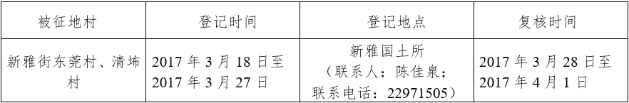 经省人民政府批准(粤国土资(建)字〔2014〕1465号文),需将广州市花都区新雅街东莞村、清㘵村属下的集体土地2.1294公顷(合31.9410亩)征收为国有土地。现将经依法批准的《征收土地方案》和市人民政府批准的《征地补偿安置方案》内容以及有关事项公告如下: