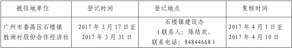 经广东省人民政府批准(粤国土资(建)字〔2017〕109号文),同意将广州市番禺区石楼镇胜洲村股份合作经济社,面积共51.1166公顷集体土地征收为国有土地。现将经依法批准的《征收土地方案》、市人民政府批准的《征地补偿安置方案》内容和有关事项公告如下: