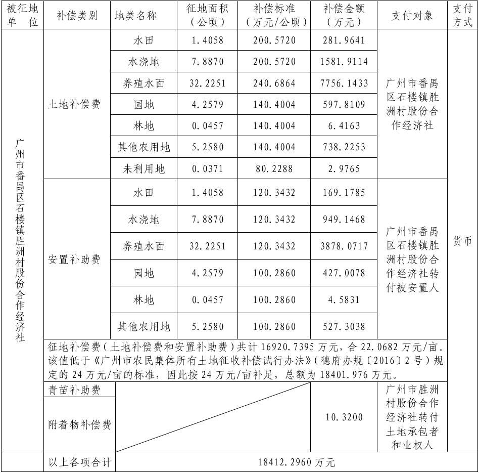 三、被征地村及面积:番禺区石楼镇胜洲村集体土地51.1166公顷(合766.7490亩),其中水田1.4058公顷(合21.0870亩)、水浇地7.8870公顷(合118.3050亩)、养殖水面32.2251公顷(合483.3765亩)、园地4.2579公顷(合63.8685亩)、林地0.0457公顷(合0.6855亩)、其他农用地5.2580公顷(合78.8700亩)、未利用地0.0371公顷(合0.5565亩)。