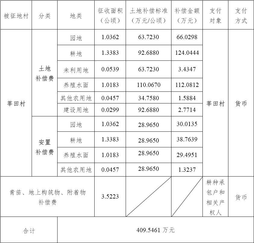 经省人民政府批准(粤国土资(建)字〔2014〕157号文),需将广州市花都区花东镇莘田村属下的集体用地3.5223公顷(合52.8345亩)征收为国有土地。现将经依法批准的《征收土地方案》和市人民政府批准的《征地补偿安置方案》内容和有关事项公告如下: