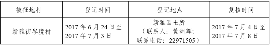 经省人民政府批准(粤国土资(建)字[2017]231号文),需将广州市花都区新雅街岑境村属下的集体土地5.2503公顷(合78.7545亩)征收为国有土地。现将经依法批准的《征收土地方案》和市人民政府批准的《征地补偿安置方案》内容和有关事项公告如下: