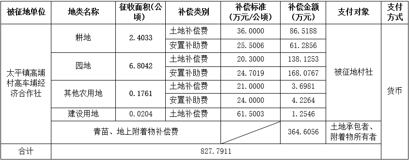 (二)本次征收土地所涉及的被安置农业人员由广州市从化区太平镇高埔村高车埔经济合作社以货币补偿等形式安置。
