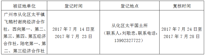 经广州市人民政府同意并经广东省人民政府批准(粤国土资(建)字〔2016〕674号)同意将广州市从化区太平镇飞鹅村地段14.0344公顷集体土地征收为国有土地。现将经依法批准的《征收土地方案》、市人民政府批准的《征地补偿安置方案》内容和有关事项公告如下: