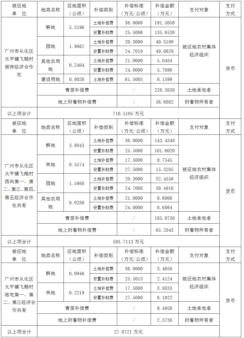 (二)本次征收土地所涉及的被安置农业人员由广州市从化区太平镇飞鹅村谢岗经济合作社,西向第一、第二、第三、第四、第五经济合作社,陆宅第一、第二、第三经济合作社以货币补偿等形式安置。