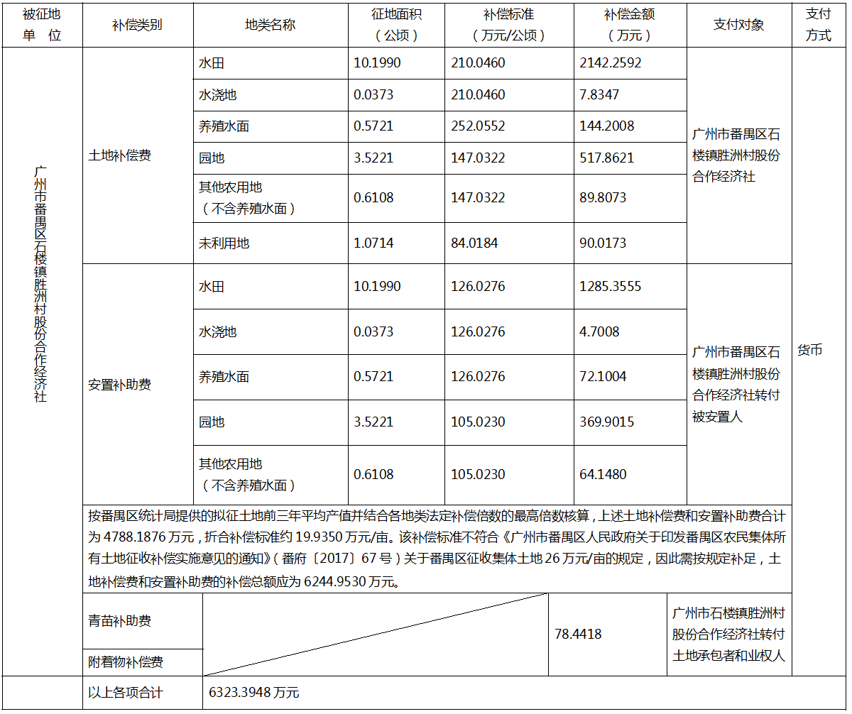 (二)本次征收土地所涉及的被安置农业人员由广州市番禺区石楼镇胜洲村股份合作经济社和广州市番禺区石楼镇茭塘西村股份合作经济社以货币补偿的形式安置。请广州市番禺区石楼镇胜洲村股份合作经济社和广州市番禺区石楼镇茭塘西村股份合作经济社在本公告期内到广州市番禺区国土资源和规划局领取办理安置农业人口征地农转非手续的函件。