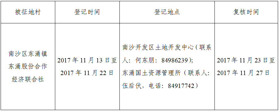 经广东省人民政府批准(粤国土资(建)字〔2017〕576号文),需将南沙区东涌镇东涌股份合作经济联合社0.7684公顷(合11.526亩)集体土地征收为国有土地。现将经依法批准的《征收土地方案》、市人民政府批准的《征地补偿安置方案》内容和有关事项公告如下: