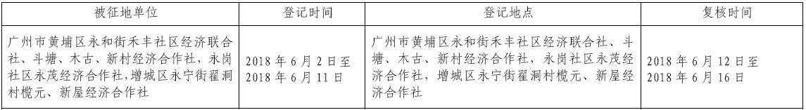 (二)本次征收土地所涉及的被安置农业人员由广州市黄埔区永和街禾丰社区经济联合社、斗塘、木古、新村经济合作社,永岗社区永茂经济合作社,增城区永宁街翟洞村榄元、新屋经济合作社在本公告期内到广州开发区 广州市黄埔区国土资源和规划局领取办理安置农业人口征地农转非手续的函件。