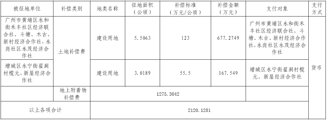 三、被征地村及面积:广州市黄埔区永和街禾丰社区经济联合社、斗塘、木古、新村经济合作社,永岗社区永茂经济合作社,增城区永宁街翟洞村榄元、新屋经济合作社属下的集体建设用地8.5252公顷。