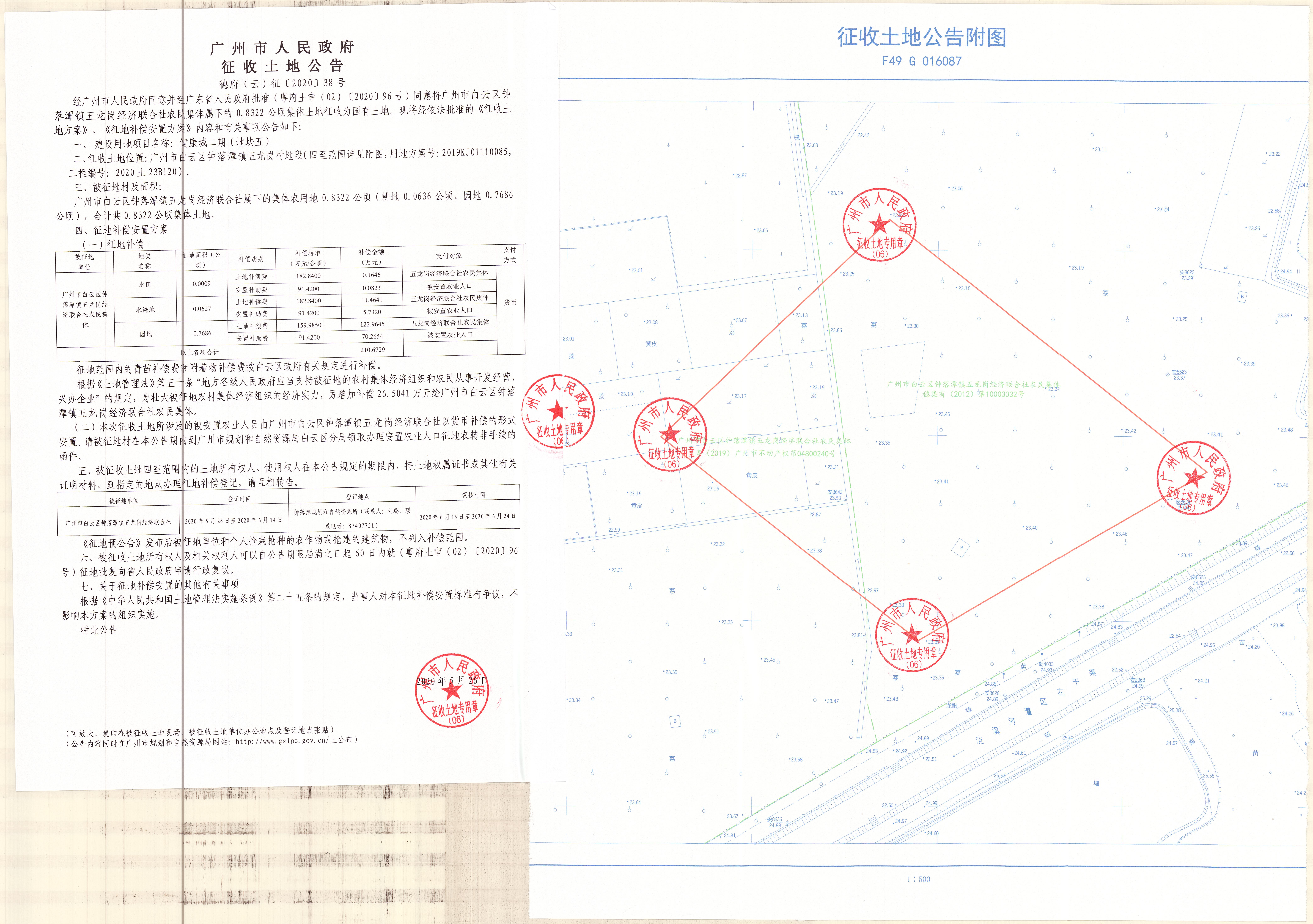 经广州市人民政府同意并经广东省人民政府批准(粤府土审(02)〔2020〕96号)同意将广州市白云区钟落潭镇五龙岗经济联合社农民集体属下的0.8322公顷集体土地征收为国有土地。现将经依法批准的《征收土地方案》、《征地补偿安置方案》内容和有关事项公告如下: