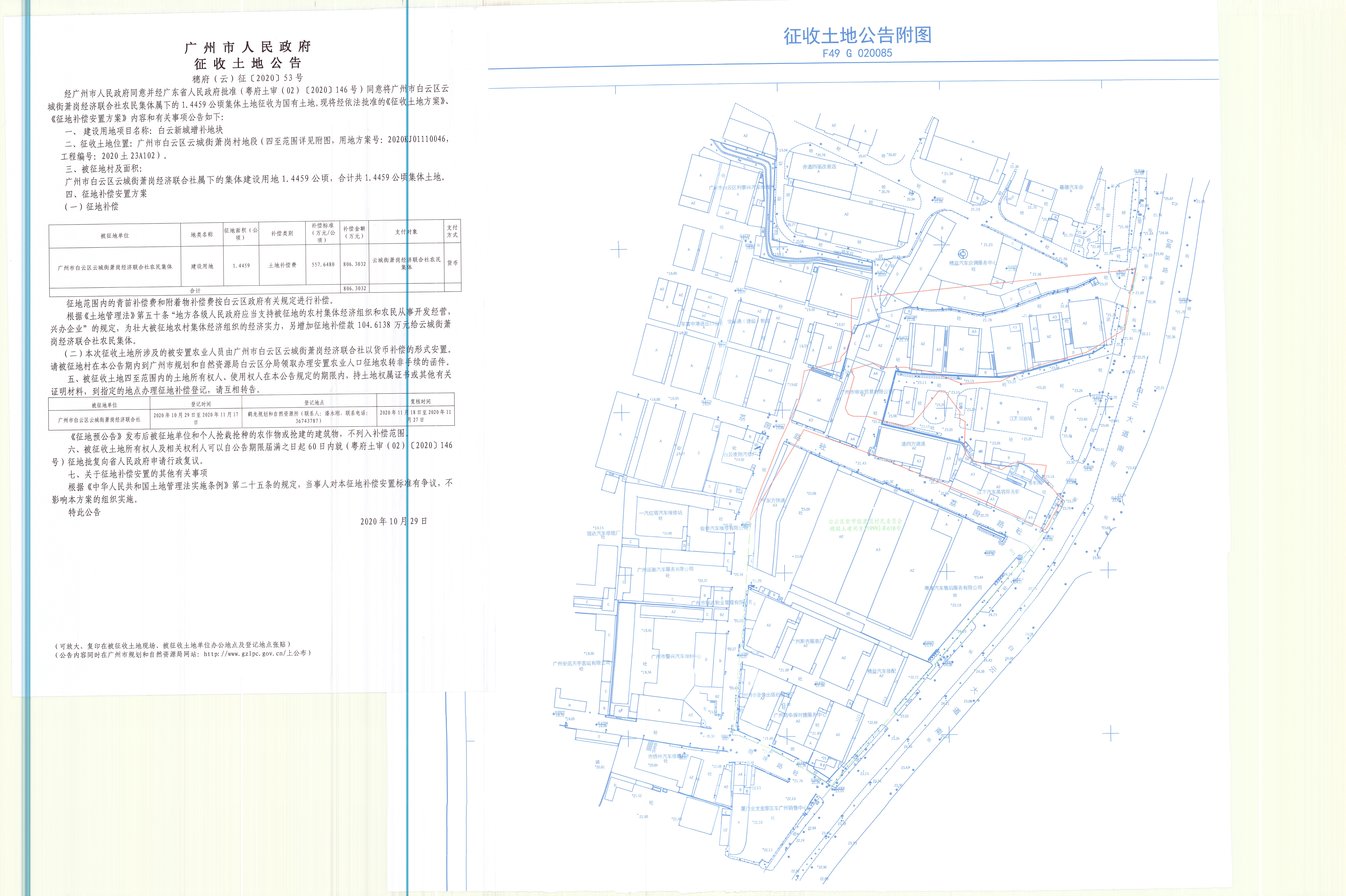 经广州市人民政府同意并经广东省人民政府批准(粤府土审(02)〔2020〕146号)同意将广州市白云区云城街萧岗经济联合社农民集体属下的1.4459公顷集体土地征收为国有土地。现将经依法批准的《征收土地方案》、《征地补偿安置方案》内容和有关事项公告如下: