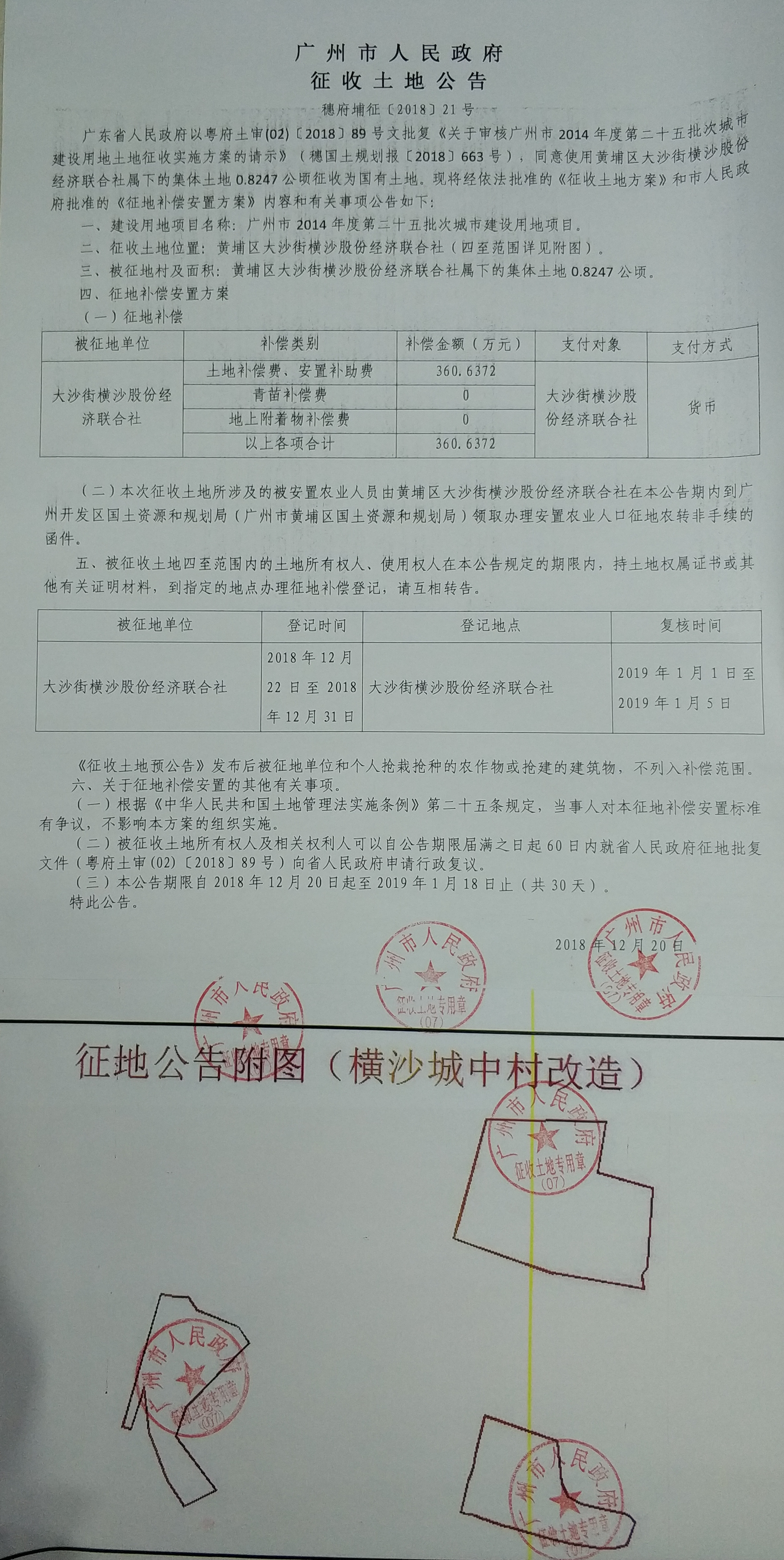 广东省人民政府以粤府土审(02)〔2018〕89号文批复《关于审核广州市2014年度第二十五批次城市建设用地土地征收实施方案的请示》(穗国土规划报〔2018〕663号),同意使用黄埔区大沙街横沙股份经济联合社属下的集体土地0.8247公顷征收为国有土地。现将经依法批准的《征收土地方案》和市人民政府批准的《征地补偿安置方案》内容和有关事项公告如下: