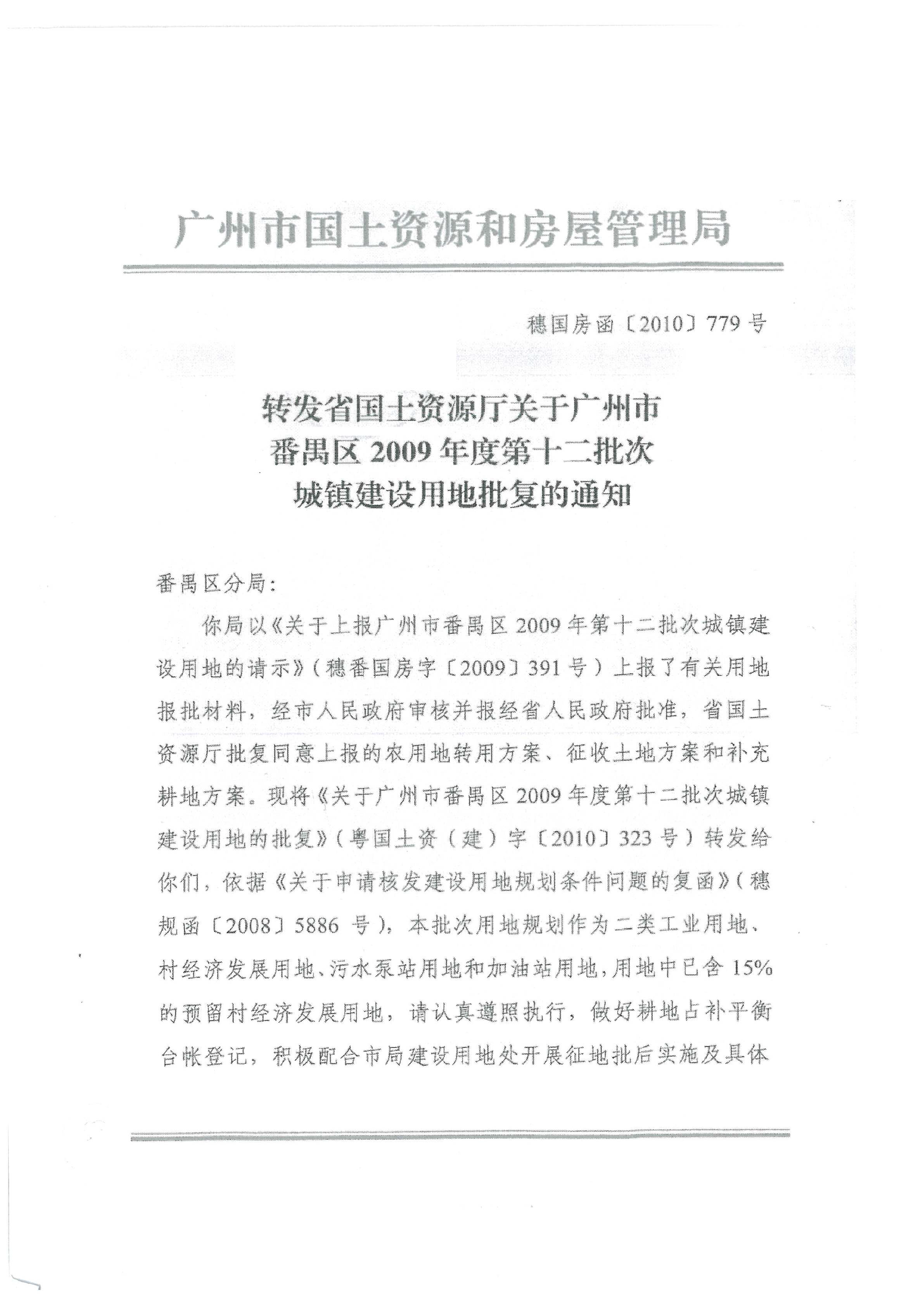 广州市国土资源和规划委员会转发省国土资源厅关于广州市番禺区2009年度第十二批次城镇建设用地批复的通知