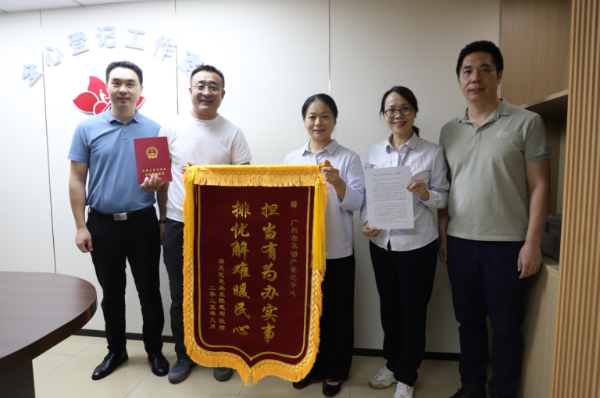 近日,广州市海天花苑金菊路商铺业主陈先生向市不动产登记中心赠送锦旗:“担当有为办实事,排忧解难暖民心”,并附感谢信表达对中心暖心服务的诚挚谢意。陈先生2010年购买的商铺因历史遗留原因,相关手续缺失长期无法办证,严重影响了房屋的租售经营及财产权益保障,成为陈先生的一块“心病”。