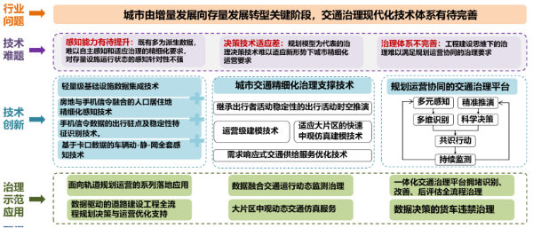项目针对当前阶段城市交通治理领域交通治理感知能力待提升、技术手段不适应、治理体系不完善等问题,研发规划运营协同的城市交通运营数据感知、稳定性特征识别和运营级交通治理模型建设技术,实现存量交通设施出行稳定性特征高精度感知,交通规划模型向运营级治理模型转变,并进行了多项示范应用,服务城市交通运营级智慧治理。