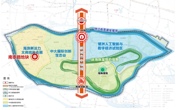 该宗地位于海珠区西部新活力文商旅融合圈范围内,面积约14.8公顷,规划总计容建筑面积约35万平方米,东临江南大道、西临宝岗大道,区位条件优越。地块原为区内最大的百货批发市场——南泰食品批发市场,存在设施陈旧、环境品质不高、产业形态低端、产值效益低下等现实状况,土地潜在价值未能充分挖掘与释放。项目规划以盘活中心城区低效用地、促进区域升级为导向,优化海珠西部商业服务功能,促进片区产城融合,激发文商融合发展新活力。