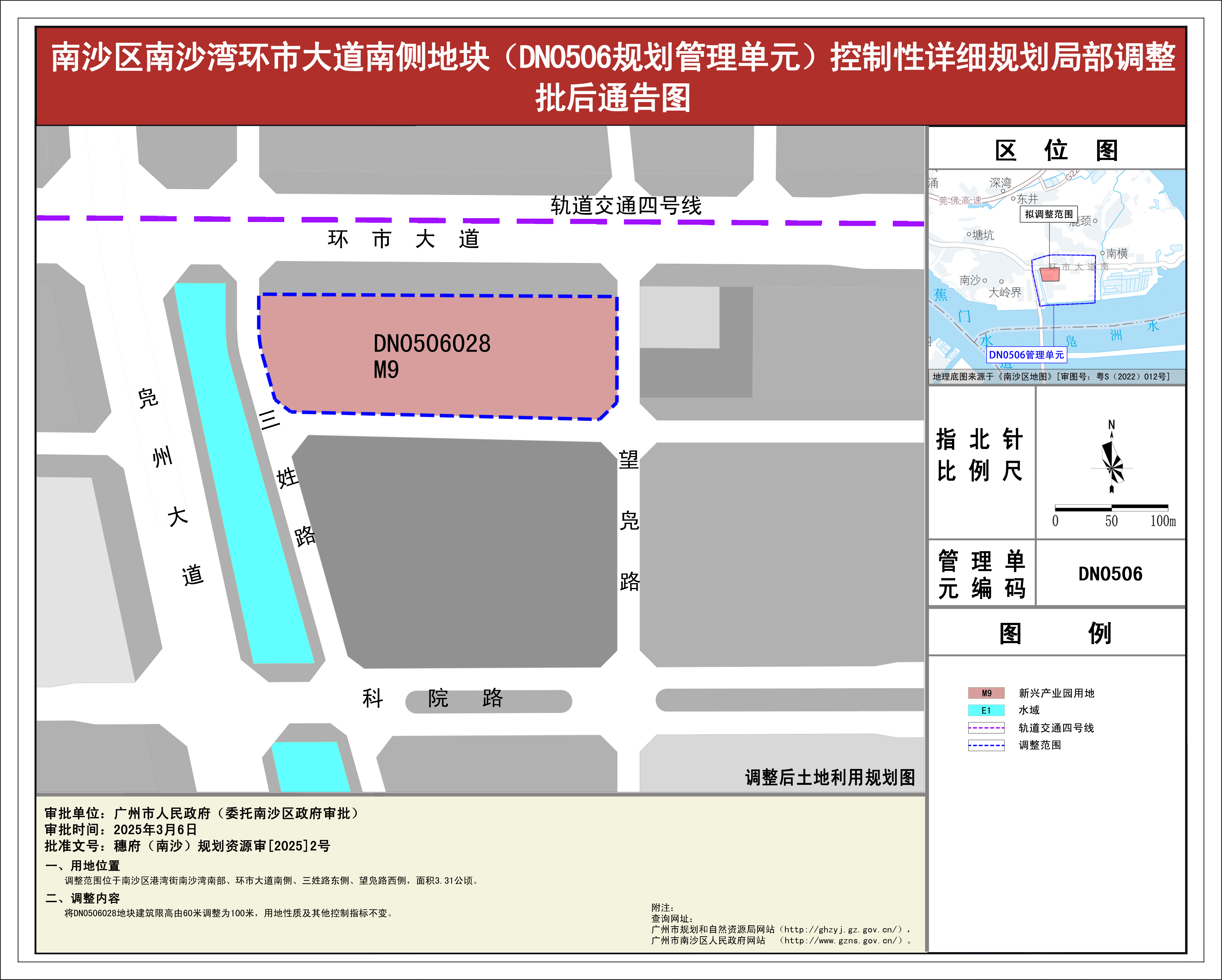 根据《广东省城市控制性详细规划管理条例》《广州市城乡规划程序规定》有关规定,《南沙区南沙湾环市大道南侧地块(DN0506规划管理单元)控制性详细规划局部调整》已完成规划技术审查、批前公示等程序,并经广州市南沙新区自然资源规划与利用委员会审议通过后获广州市南沙区人民政府(受广州市人民政府委托)批准(穗府(南沙)规划资源审〔2025〕2号),自批准之日(2025年3月6日)起生效。