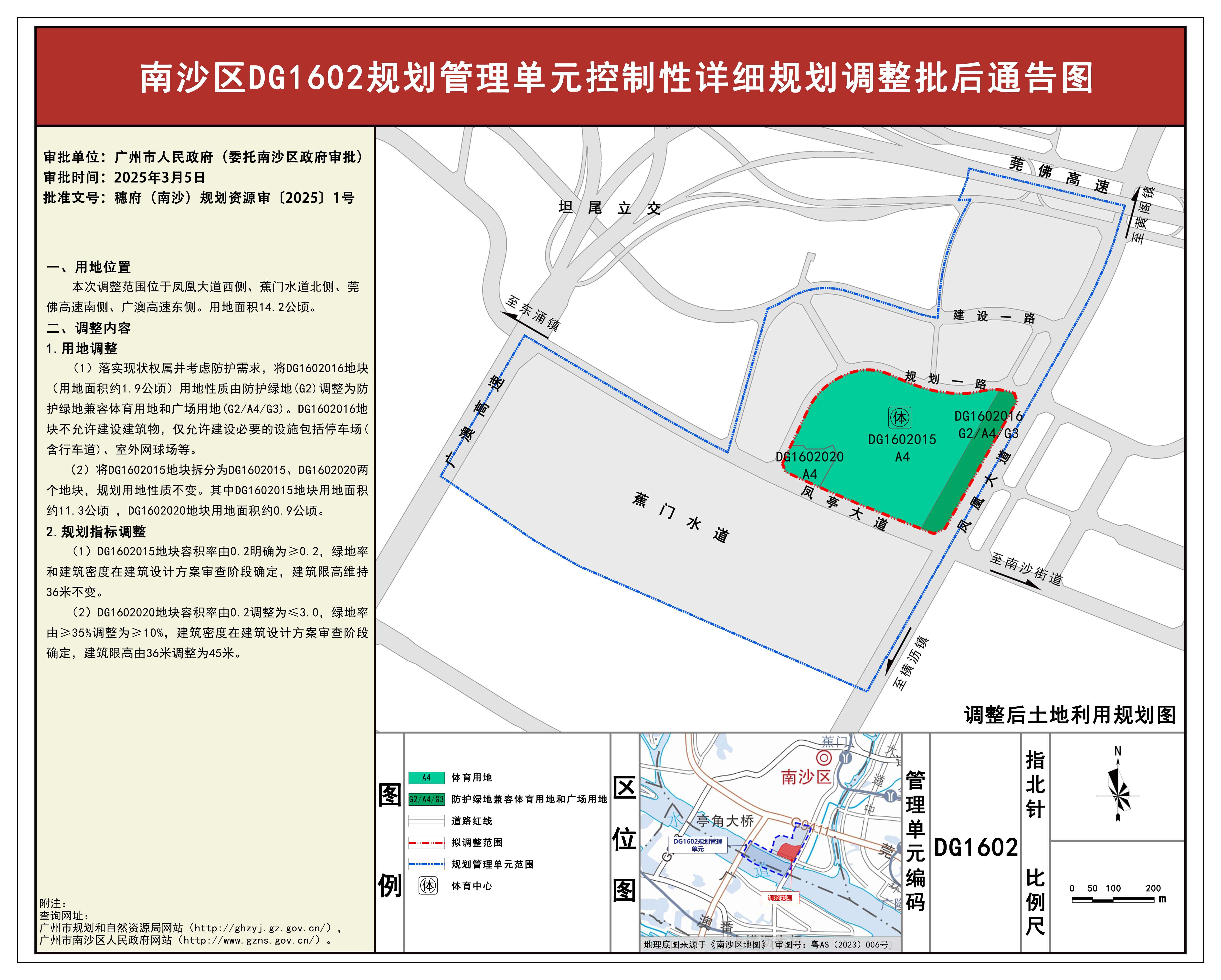 根据《广东省城市控制性详细规划管理条例》《广州市城乡规划程序规定》有关规定,《南沙区DG1602规划管理单元控制性详细规划调整》已完成规划技术审查、批前公示等程序,并经第一届广州市南沙新区自然资源规划与利用委员会审议通过后,获广州市人民政府(委托广州市南沙区人民政府)批准(穗府(南沙)规划资源审〔2025〕1号),自批准之日(2025年3月5日)起生效。