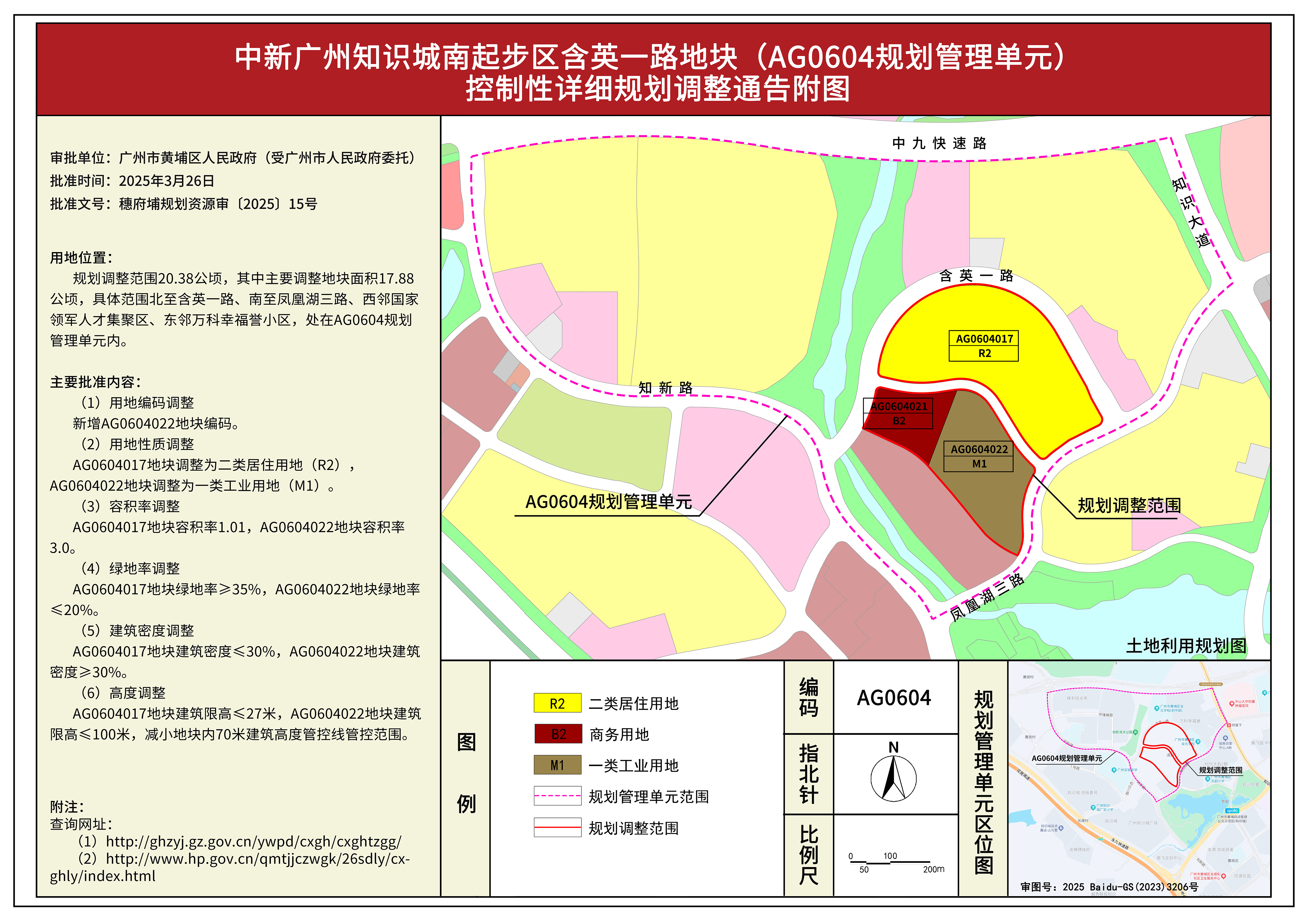 根据《广东省城市控制性详细规划管理条例》有关规定,《中新广州知识城南起步区含英一路地块(AG0604规划管理单元)控制性详细规划调整》已获广州市黄埔区人民政府批准(受广州市人民政府委托)(穗府埔规划资源审〔2025〕15号),自批准之日(2025年3月26日)起生效。