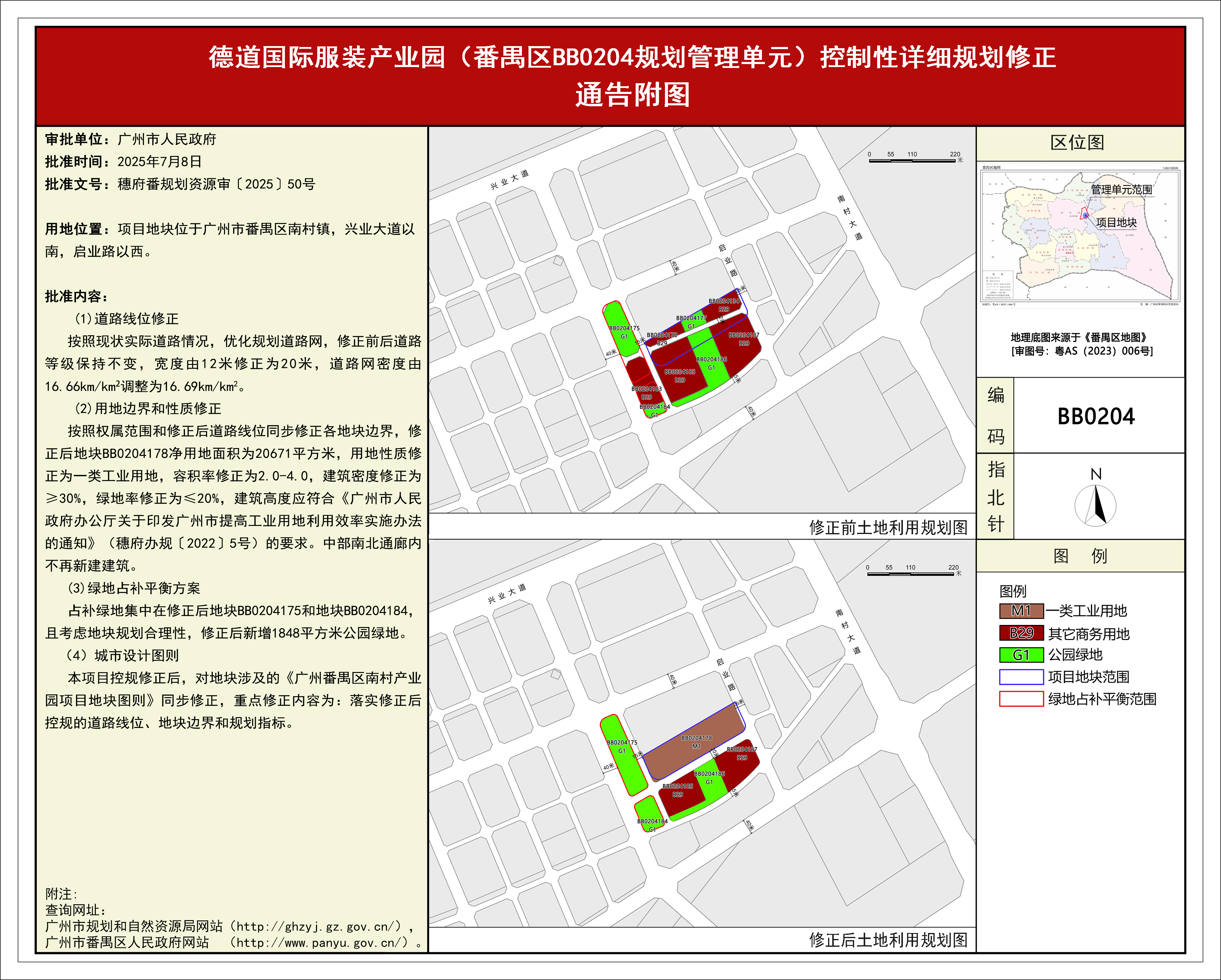 根据《广东省城市控制性详细规划管理条例》,《德道国际服装产业园(番禺区BB0204规划管理单元)控制性详细规划修正》规划成果已完成规划技术审查、批前公示、征询相关单位意见等程序,并经十八届政府第141 次常务会议审议通过后获广州市人民政府批准(穗府番规划资源审﹝2025﹞50号),自批准之日(2025年7月8日)起生效。