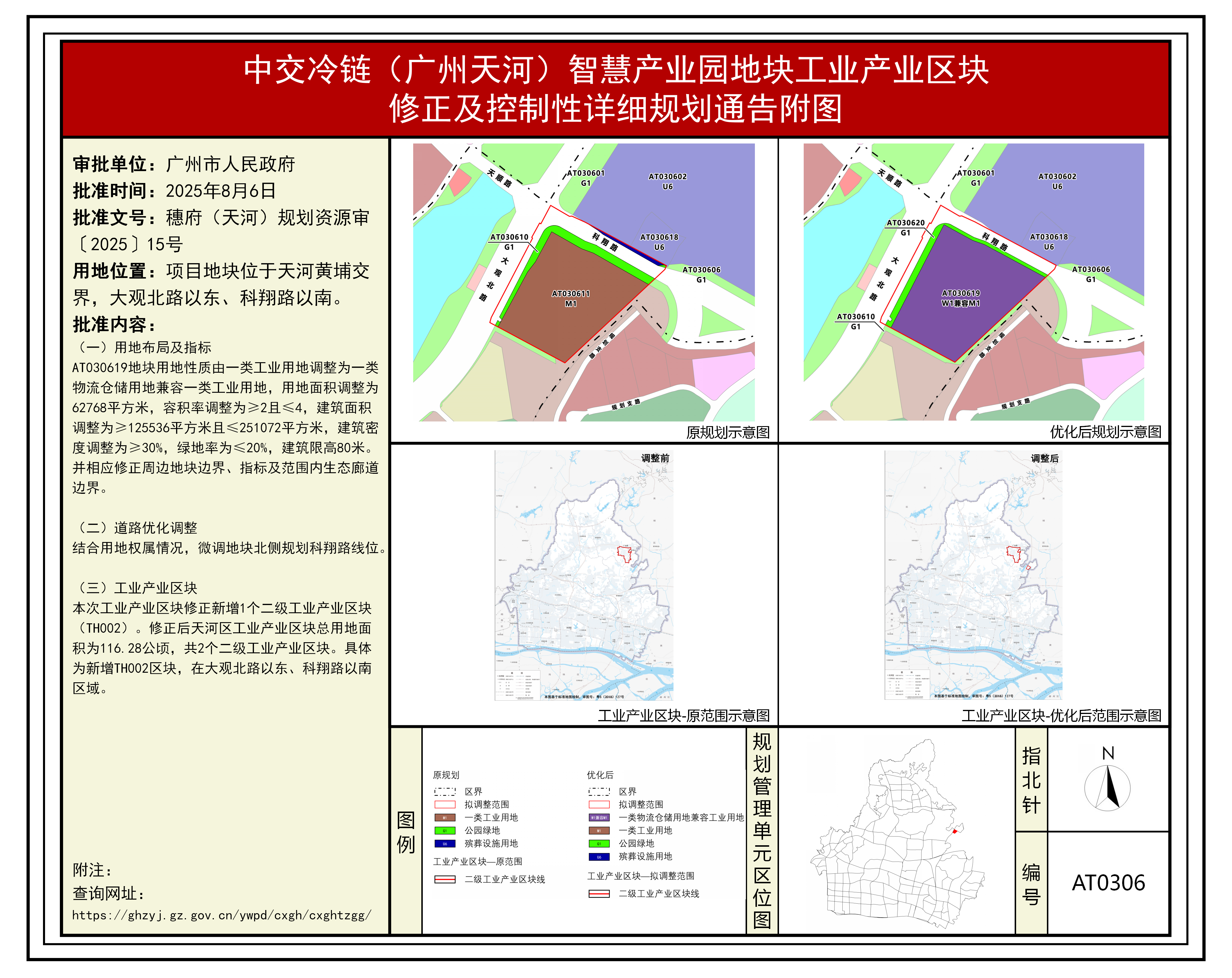 根据《中华人民共和国城乡规划法》、《广东省城市控制性详细规划管理条例》、《广州市城乡规划程序规定》、《广州市人民政府关于将一批市级行政职权事项继续委托区实施的决定》(穗府〔2019〕8号)、《广州市人民政府关于收回一批市级行政权力事项的决定》(广州市人民政府令188号)及《广州市工业产业区块管理办法》等相关文件规定,《中交冷链(广州天河)智慧产业园地块工业产业区块修正及控制性详细规划》成果已经广州市人民政府批准(穗府(天河)规划资源审〔2025〕15号),自批准之日(2025年8月6日)起生效。