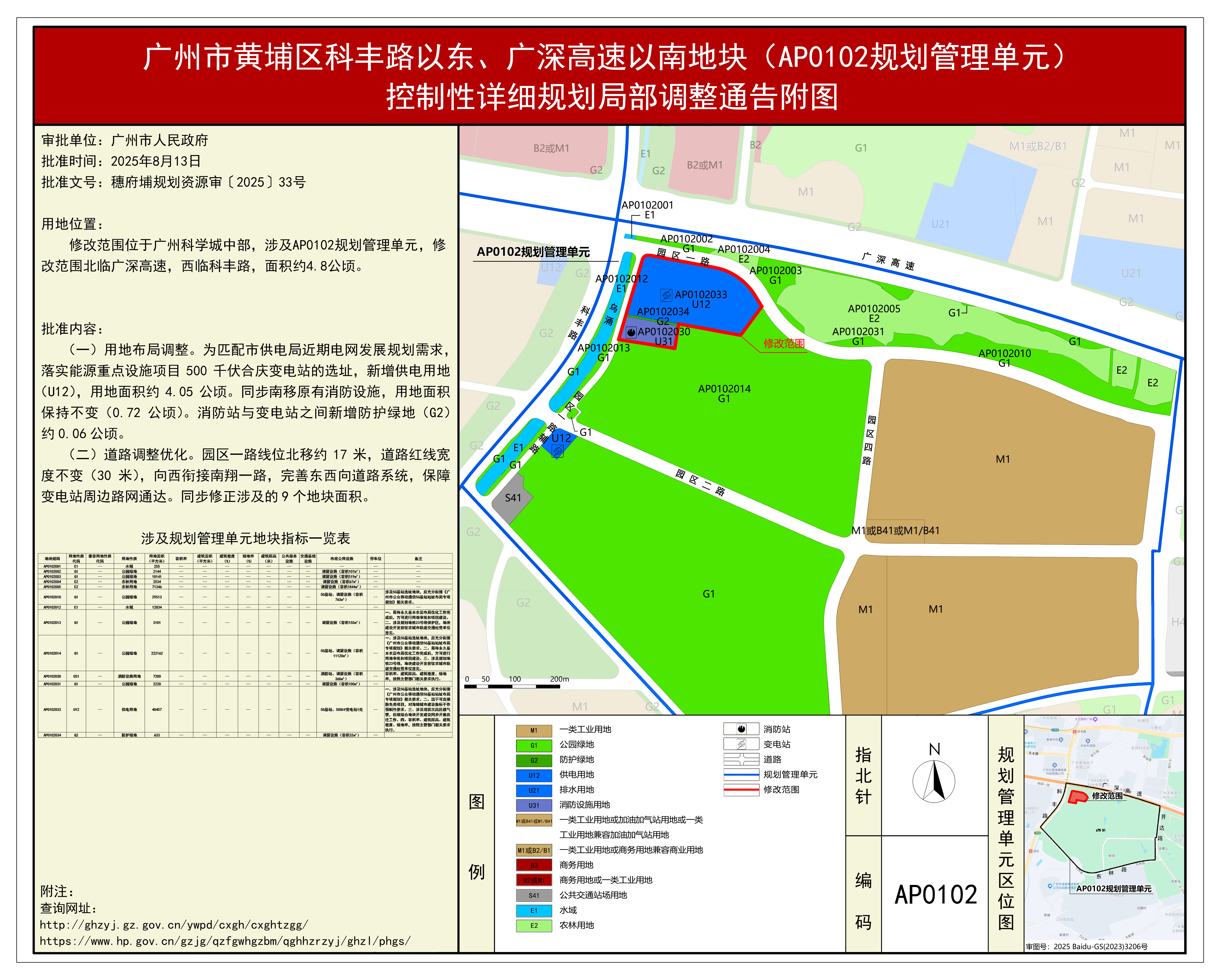 根据《广东省城市控制性详细规划管理条例》要求,《广州市黄埔区科丰路以东、广深高速以南地块(AP0102规划管理单元)控制性详细规划局部调整》已完成规划技术审查、批前公示等程序,并经广州市黄埔区广州开发区城乡规划委员会审议通过后获黄埔区人民政府(受市人民政府委托)批准(穗府埔规划资源审〔2025〕33号),自批准之日(2025年8月13日)起生效。