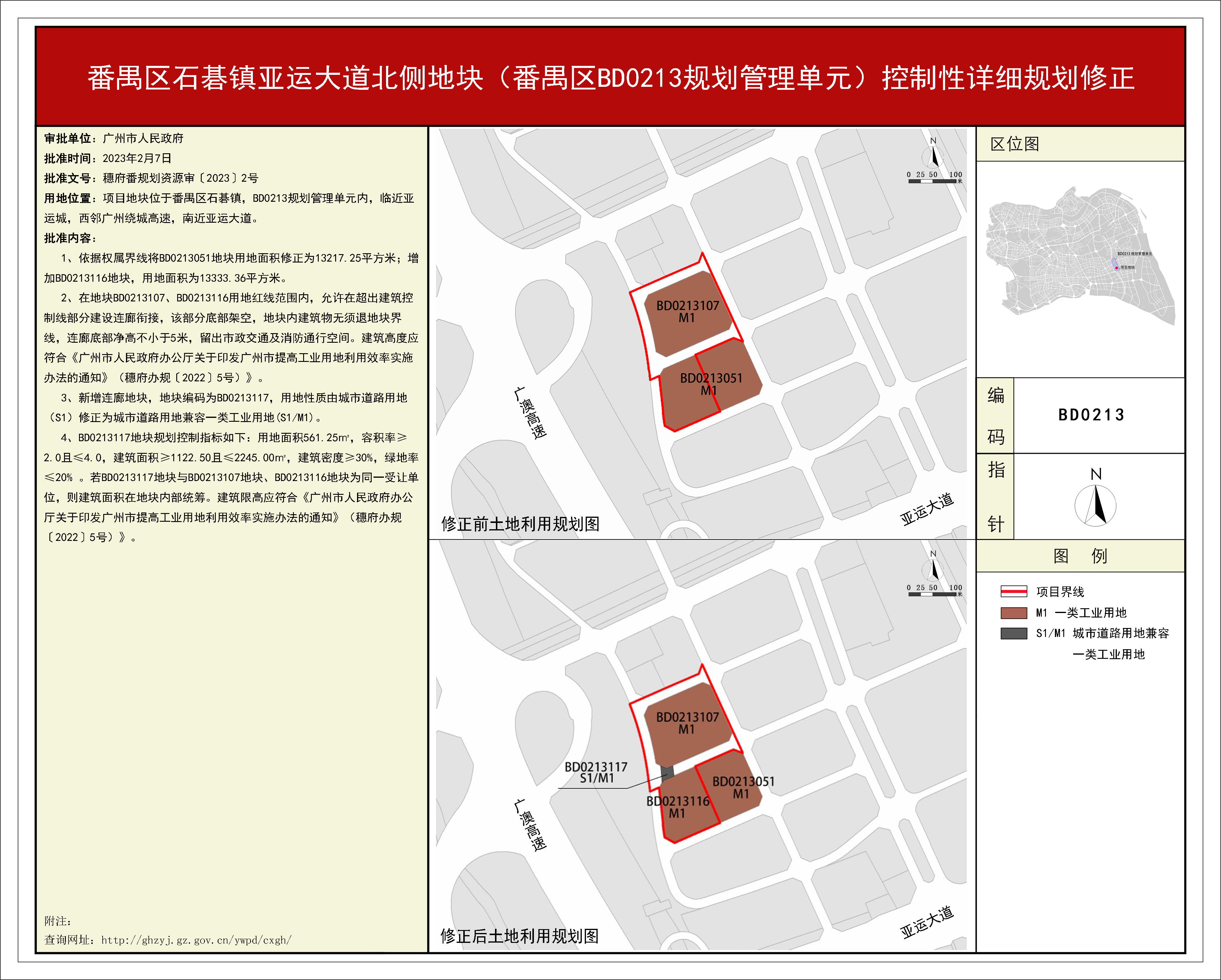 根据《广东省城市控制性详细规划管理条例》、《广州市人民政府关于将一批市级行政职权事项继续委托区实施的决定》(穗府[2019]8号)、《广州市人民政府关于收回一批市级行政权力事项的决定》(广州市人民政府令第188号),《番禺区石碁镇亚运大道北侧地块(番禺区BD0213规划管理单元)控制性详细规划修正》规划成果已完成规划技术审查、批前公示等程序,并经番禺区土地和规划领导小组会议审议通过后获广州市人民政府批准,自批准之日(2023年2月7日)起生效。