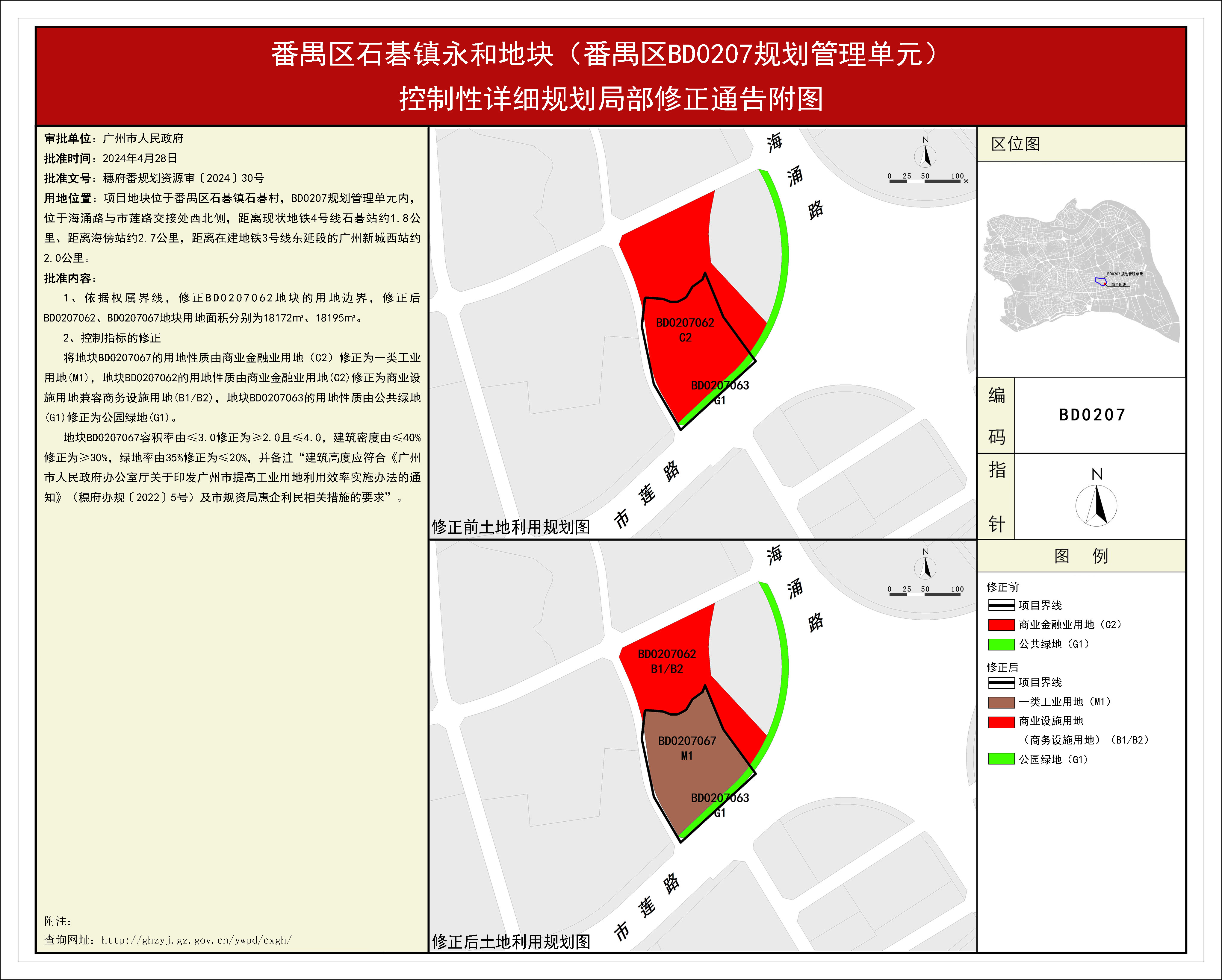 根据《广东省城市控制性详细规划管理条例》、《广州市人民政府关于将一批市级行政职权事项继续委托区实施的决定》(穗府[2019]8号)、《广州市人民政府关于收回一批市级行政权力事项的决定》(广州市人民政府令第188号),《番禺区石碁镇永和地块(番禺区BD0207规划管理单元)控制性详细规划局部修正》规划成果已完成规划技术审查、批前公示等程序,并经番禺区土地和规划领导小组会议审议通过后获广州市人民政府批准,自批准之日(2024年4月28日)起生效。