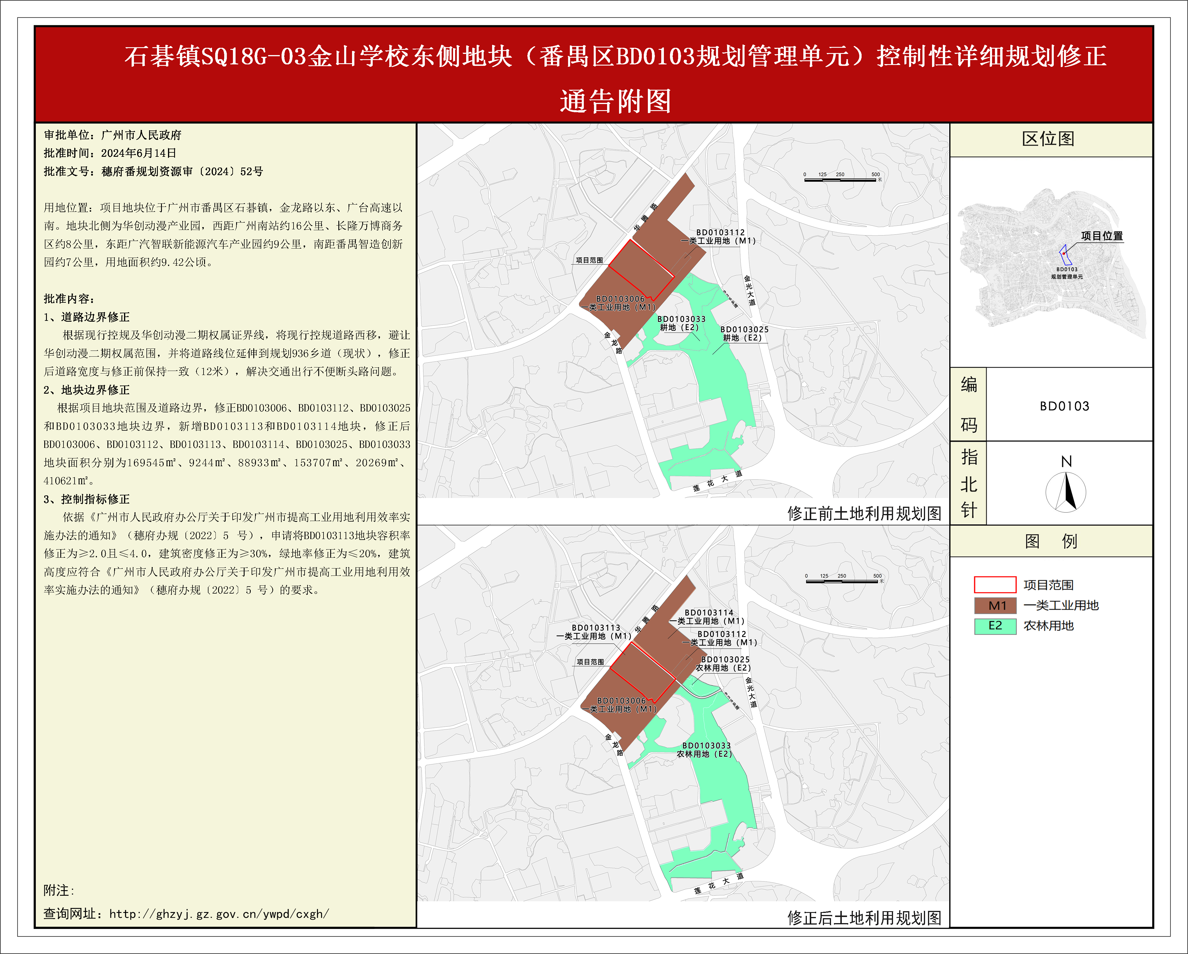 根据《广东省城市控制性详细规划管理条例》,《石碁镇SQ18G-03金山学校东侧地块(番禺BD0103规划管理单元)控制性详细规划修正》规划成果已完成规划技术审查、批前公示、征询相关单位意见等程序,并经番禺区土地和规划领导小组会议审议通过后获广州市人民政府批准(穗府番规划资源审﹝2024﹞52号),自批准之日(2024年6月14日)起生效。