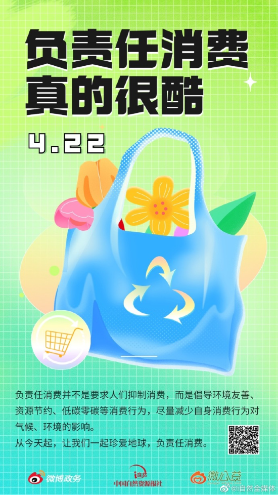 【[来][来]#负责任消费真的很酷# 】负责任消费并不是要求人们抑制消费,而是倡导环境友善、资源节约、低碳零碳等消费行为,尽量减少自身消费行为对气候、环境的影响。#第54个世界地球日# 从今天起,让我们一起珍爱地球,负责任消费。