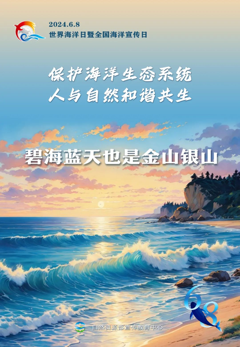 2024年6月8日是第16个世界海洋日和第17个全国海洋宣传日,活动主题是“保护海洋生态系统 人与自然和谐共生”。自然资源部宣传教育中心策划制作了宣传海报,供各地下载传播。