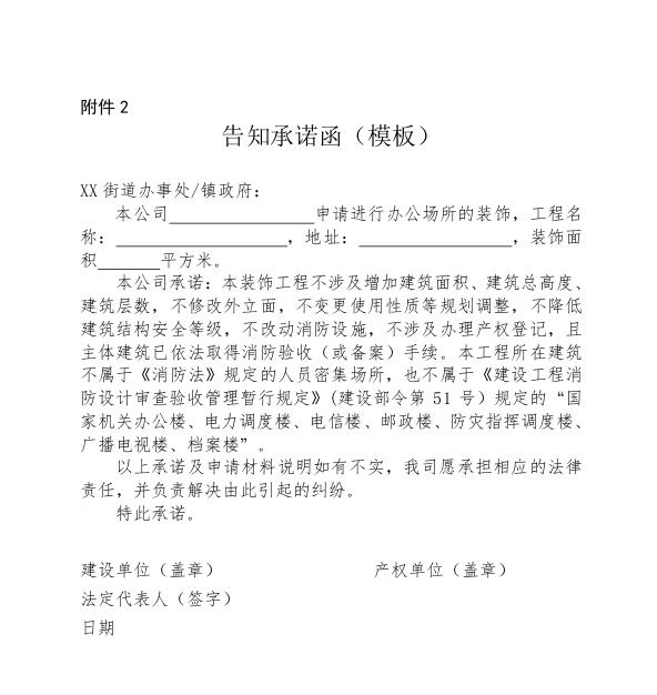 1.属于豁免行政审批实施范围的3000平方米以下办公场所装饰工程施工前,由建设单位填写告知承诺(见附件2),并按照《广州市加强临时性建筑工程和限额以下小型工程建设管理工作的通知》(穗建规字〔2019〕4号),提交资料报送属地街、镇办理开工建设信息录入管理手续。