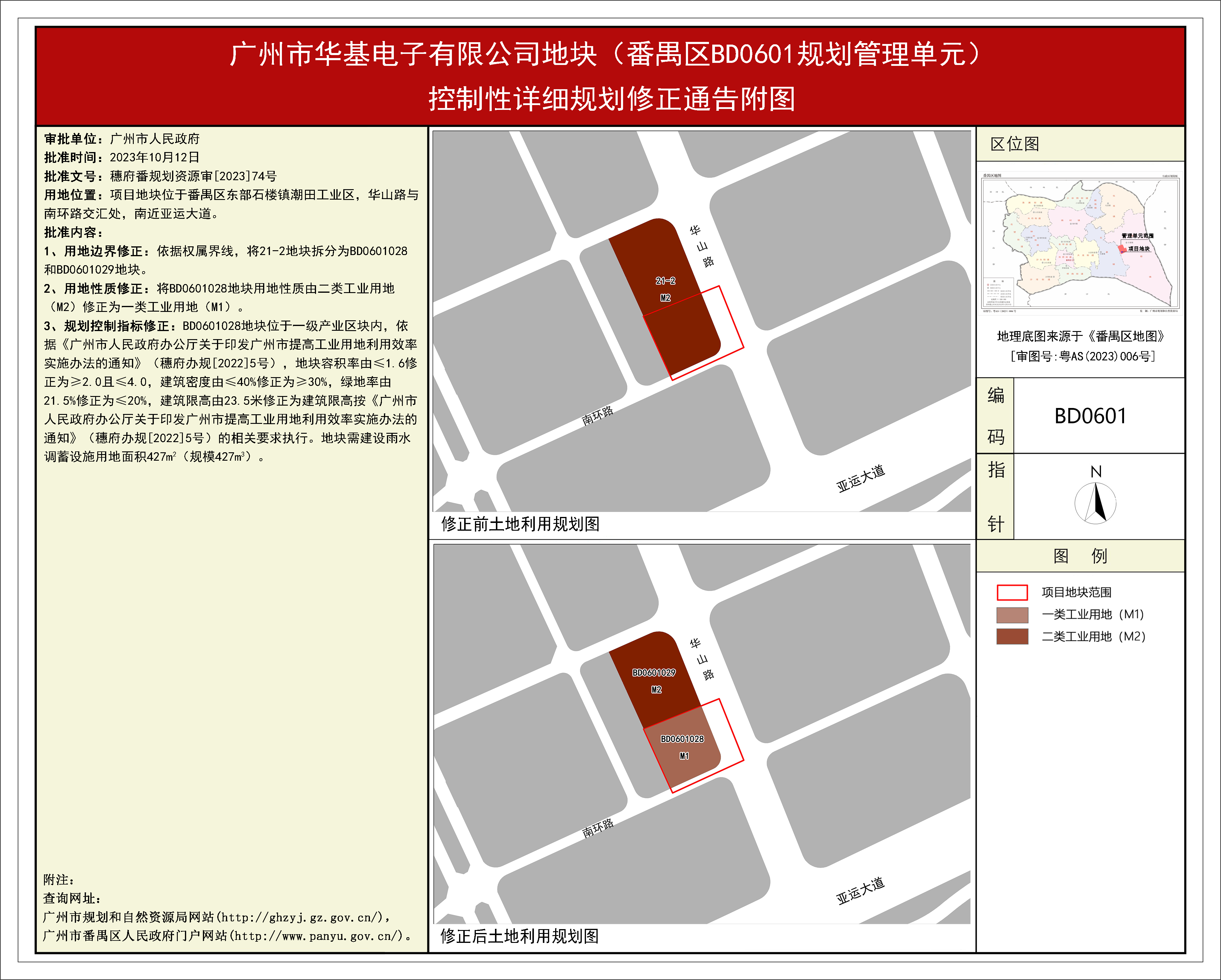 《广州市华基电子有限公司地块(番禺区BD0601规划管理单元)控制性详细规划修正》规划成果已完成规划技术审查、批前公示、征询相关单位意见等程序,并经番禺区土地和规划领导小组会议审议通过后获广州市人民政府批准(穗府番规划资源审﹝2023﹞74号),自批准之日(2023年10月12日)起生效。