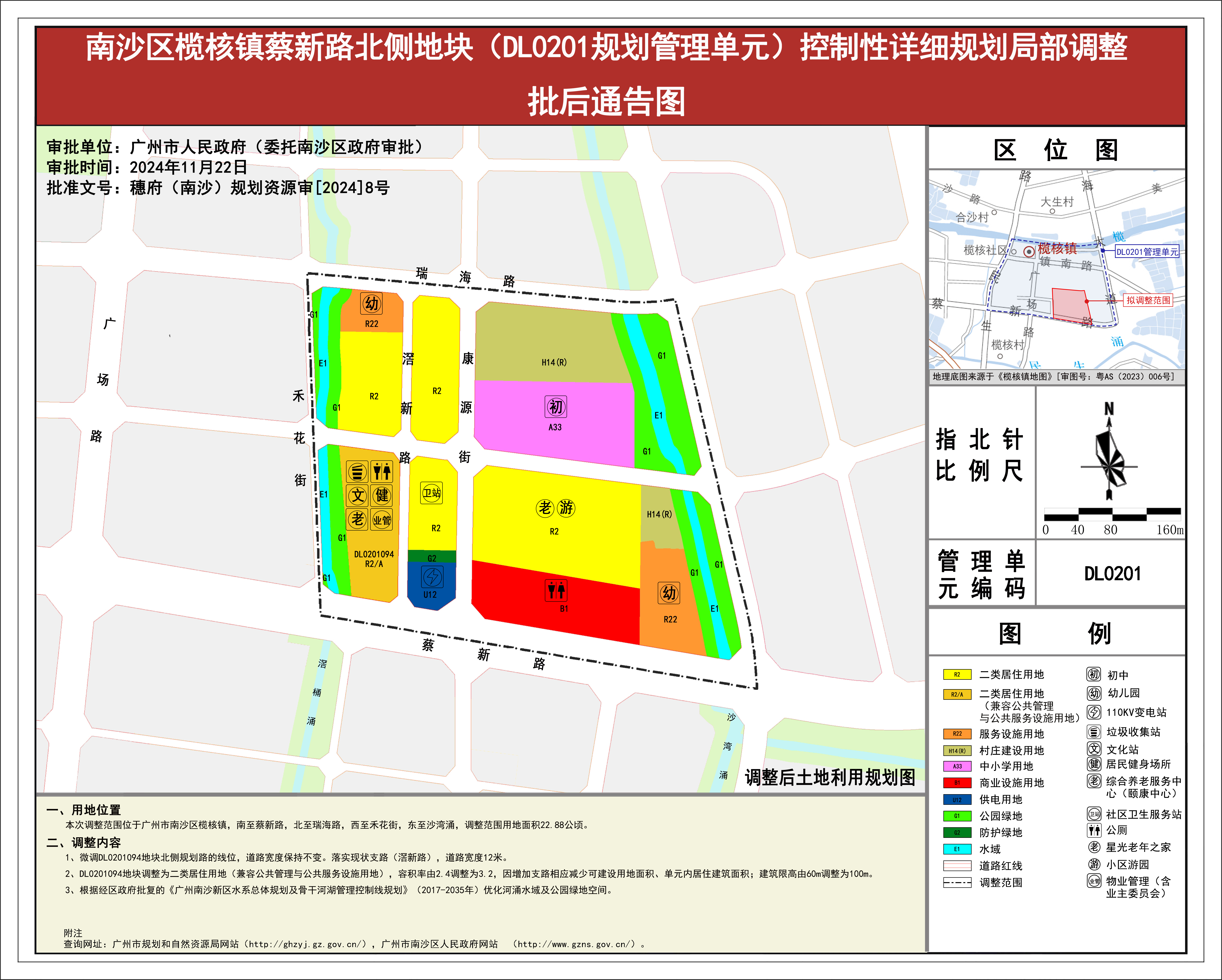 根据《广东省城市控制性详细规划管理条例》《广州市城乡规划程序规定》有关规定,《南沙区榄核镇蔡新路北侧地块(DL0201规划管理单元)控制性详细规划局部调整》已完成规划技术审查、批前公示等程序,并经第一届广州市南沙新区自然资源规划与利用委员会(利用委)2024年第五次会议审议通过后,获广州市南沙区人民政府(受广州市人民政府委托)批准(穗府(南沙)规划资源审〔2024〕8号),自批准之日(2024年11月22日)起生效。