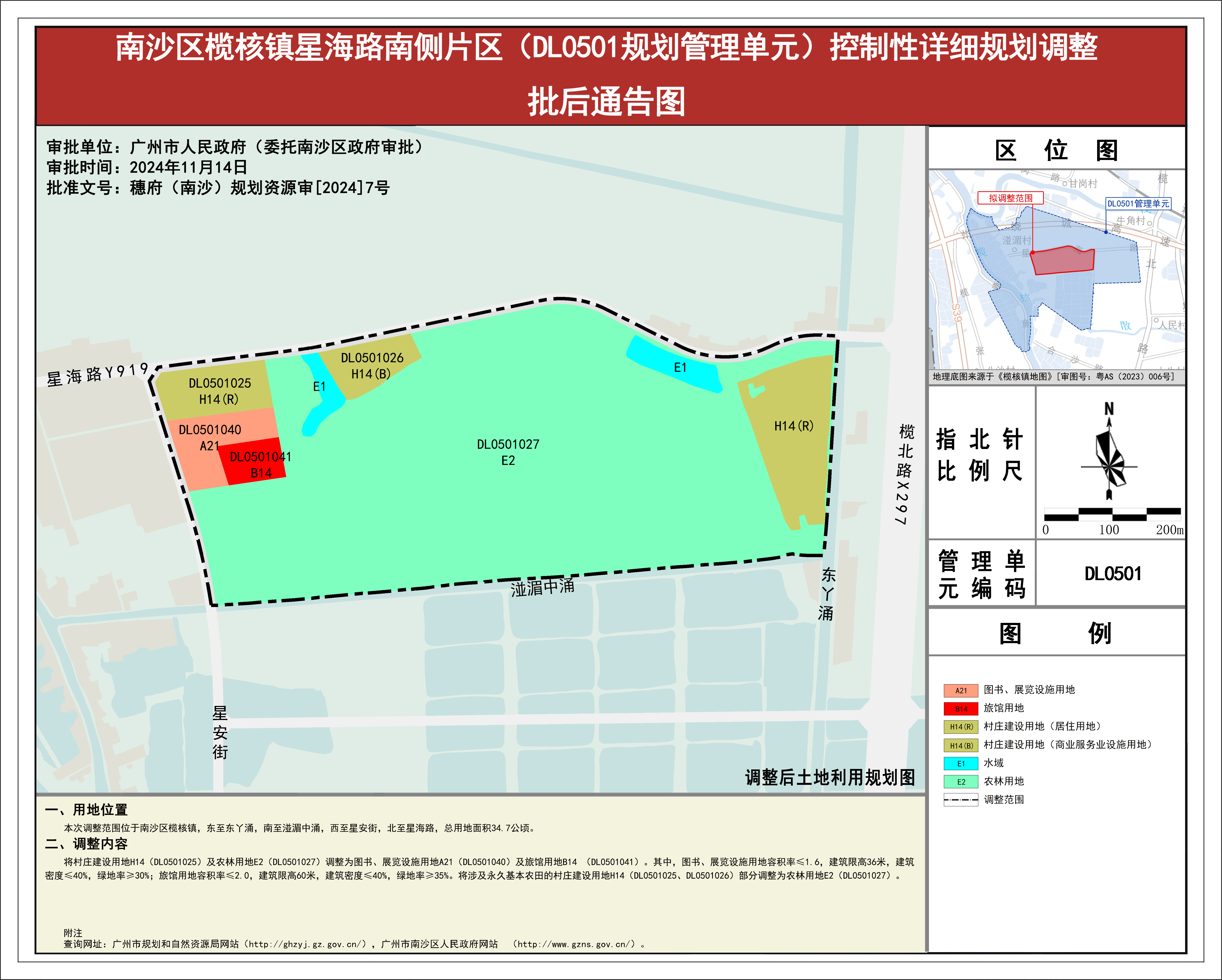 根据《广东省城市控制性详细规划管理条例》《广州市城乡规划程序规定》有关规定,《南沙区榄核镇星海路南侧片区(DL0501规划管理单元)控制性详细规划调整》已完成规划技术审查、批前公示等程序,并经第一届广州市南沙新区自然资源规划与利用委员会(国土空间规划委员会)第七次会议审议通过后,获广州市南沙区人民政府(受广州市人民政府委托)批准(穗府(南沙)规划资源审〔2024〕7号),自批准之日(2024年11月14日)起生效。
