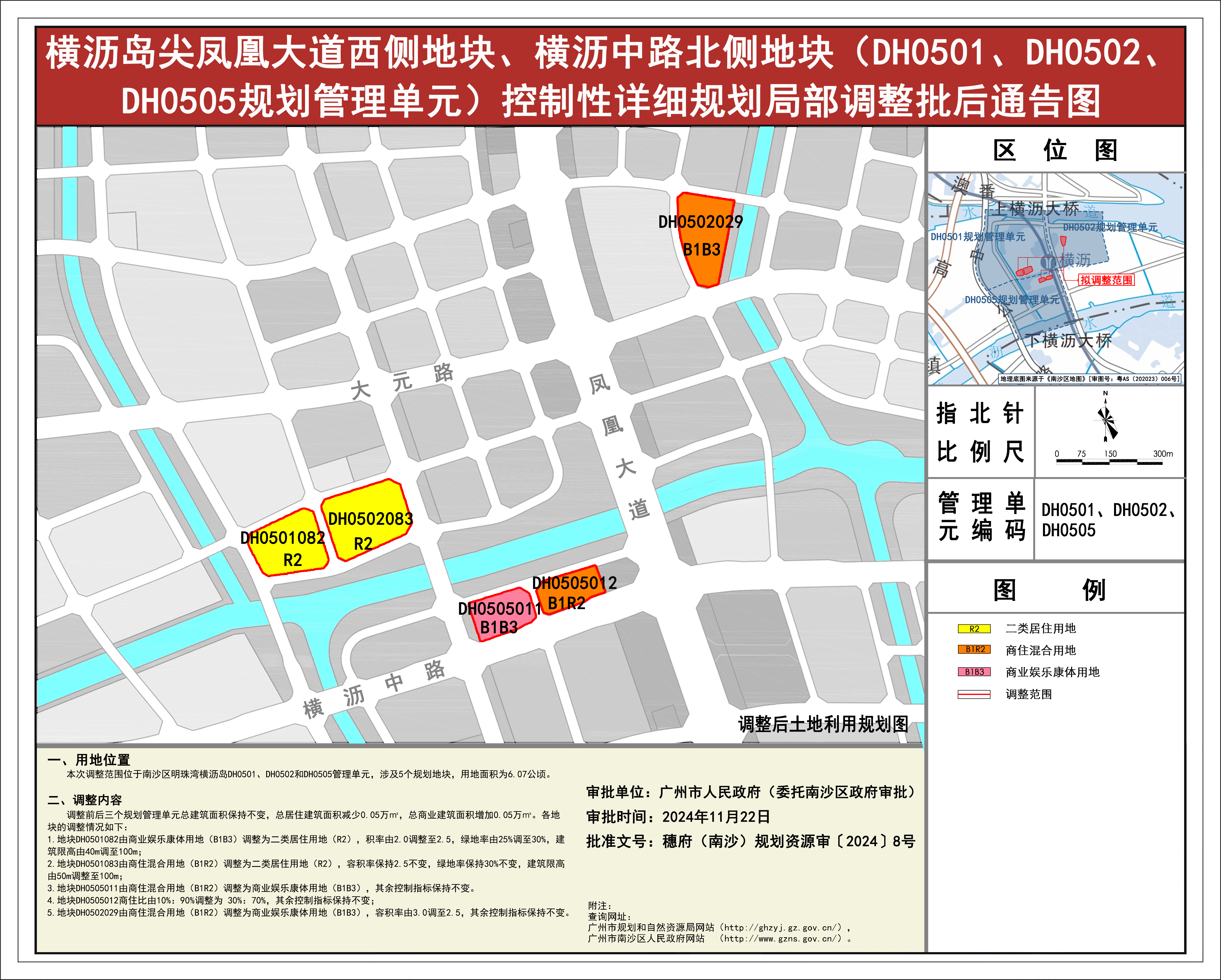 根据《广东省城市控制性详细规划管理条例》《广州市城乡规划程序规定》有关规定,《横沥岛尖凤凰大道西侧地块、横沥中路北侧地块(DH0501、DH0502、DH0505规划管理单元)控制性详细规划局部调整》已完成规划技术审查、批前公示等程序,并经广州市南沙新区自然资源规划与利用委员会审议通过后获广州市南沙区人民政府(受广州市人民政府委托)批准(穗府(南沙)规划资源审〔2024〕8号),自批准之日(2024年11月22日)起生效。