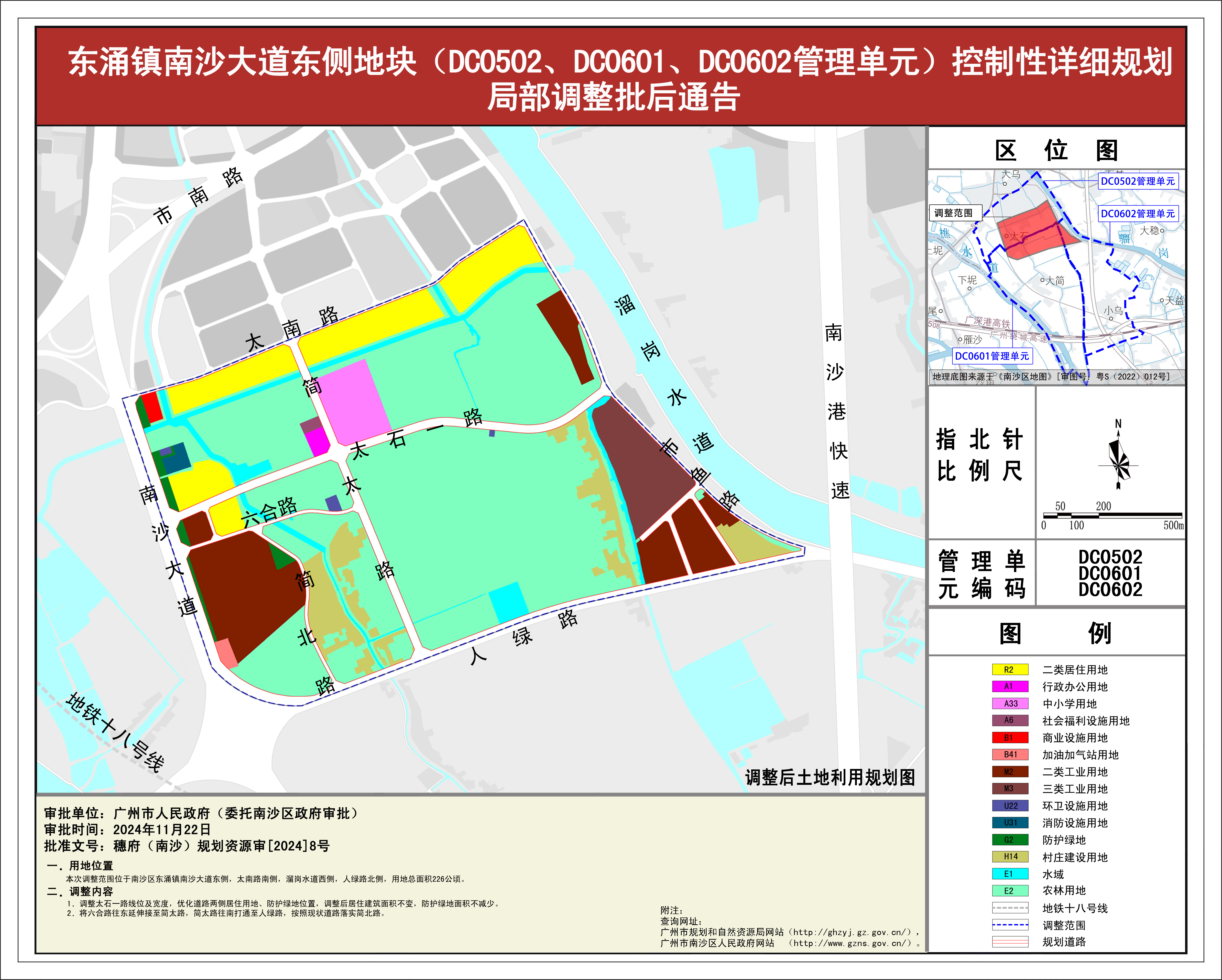 根据《广东省城市控制性详细规划管理条例》《广州市城乡规划程序规定》有关规定,《东涌镇南沙大道东侧地块(DC0502、DC0601、DC0602管理单元)控制性详细规划局部调整》已完成规划技术审查、批前公示等程序,并经广州市南沙新区自然资源规划与利用委员会审议通过后获广州市南沙区人民政府(受广州市人民政府委托)批准(穗府(南沙)规划资源审〔2024〕8号),自批准之日(2024年11月22日)起生效。