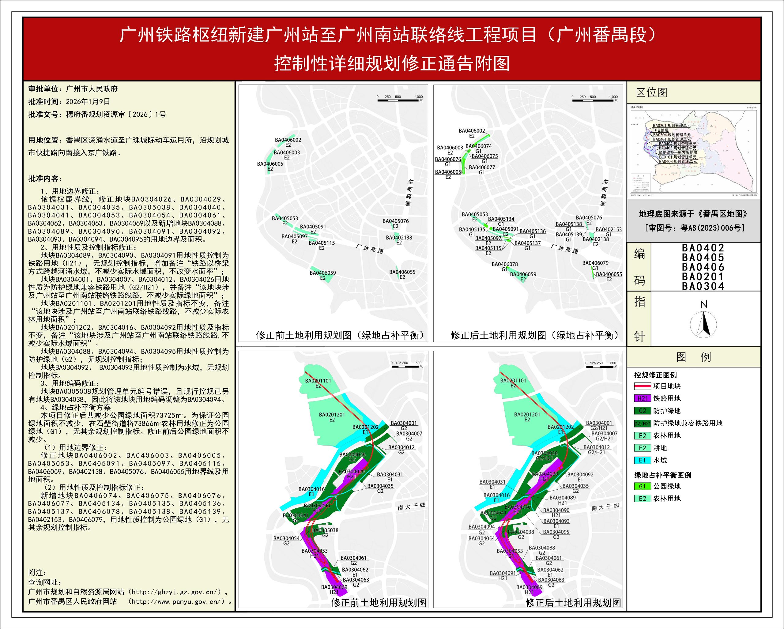 根据《广东省城市控制性详细规划管理条例》、《广州市人民政府关于将一批市级行政职权事项继续委托区实施的决定》(穗府〔2019〕8号)、《广州市人民政府关于收回一批市级行政权力事项的决定》(广州市人民政府令第188号),《广州铁路枢纽新建广州站至广州南站联络线工程项目(广州番禺段)控制性详细规划修正》规划成果已完成规划技术审查、批前公示、征询相关单位意见等程序,并经广州市番禺区土地和规划工作专题会议2025年度第5次会议审议通过后获广州市人民政府批准(穗府番规划资源审〔2026〕1号),自批准之日(2026年1月9日)起生效。