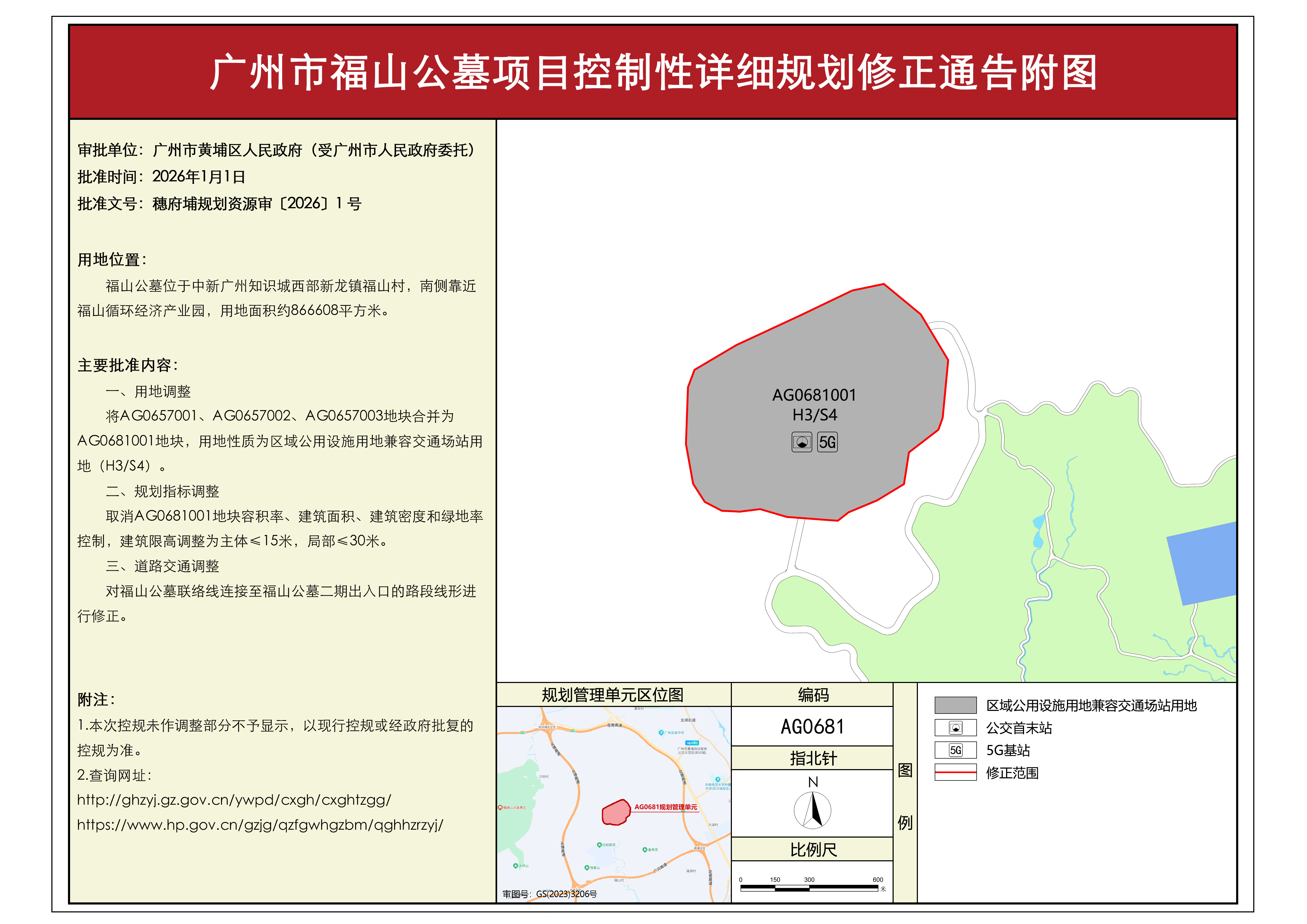 根据《广东省城市控制性详细规划管理条例》有关规定,《广州市福山公墓项目控制性详细规划修正》已获广州市黄埔区人民政府批准(受广州市人民政府委托)(穗府埔规划资源审〔2026〕1号),自批准之日(2026年1月1日)起生效。