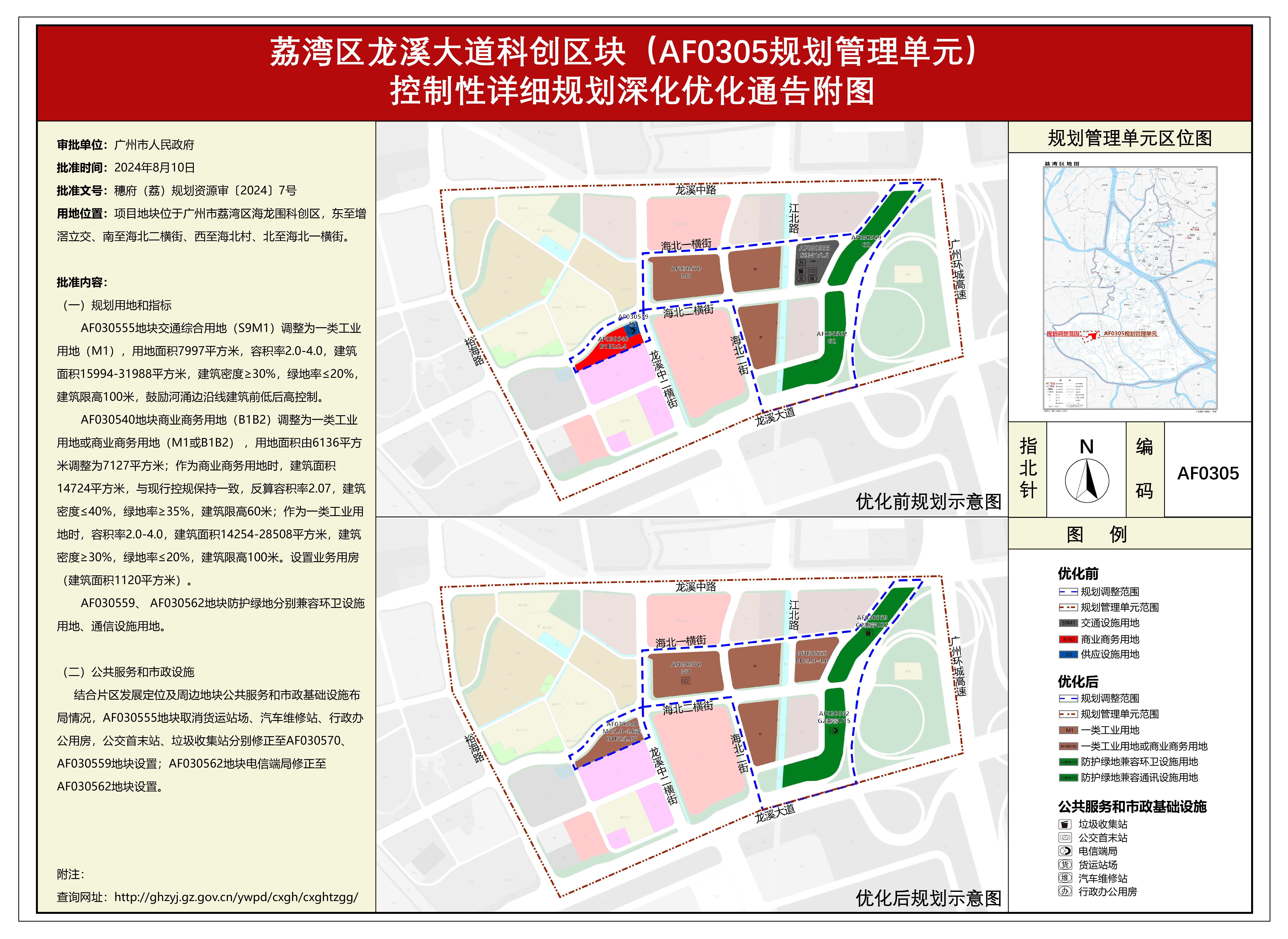 关于公布实施《荔湾区龙溪大道科创区块(AF0305规划管理单元)控制性详细规划深化优化》等4项规划成果的通告