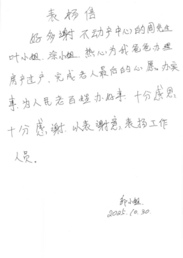 原来,该中心在了解到邹女士父亲因重病无法到场办理不动产转移登记后,立即启动“急事急办”机制,推荐其使用“互联网+不动产登记在线委托”方式。老人在病床上完成线上授权,即可由家属代为办理,全程无需缴纳委托见证费用。在征得同意后,该中心迅速开启绿色通道优先受理,安排专人全程指导、加急审核,将原本需1-2天的“身份核验、签名确认及视频见证”等在线委托流程提速至“当场办结”,高效完成产权转移,传递出政务服务守护亲情的民生温度。