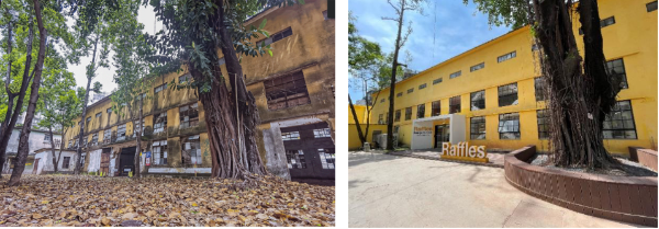 坚守文脉传承,留住城市记忆。项目高度重视建筑历史肌理的保护,最大限度的保留建筑空间特质与围合关系。对园区内两座传统风貌建筑采取“原样修缮”的提升策略,保持外观立面、建筑结构整体不发生改变,仅做立面翻新、破损整修以及局部入口景观提升,既保留了老建筑的历史韵味与建筑特色,又通过新材料、新建筑手法与新功能布局,使老建筑满足新的使用需求。