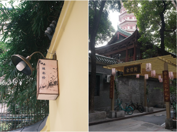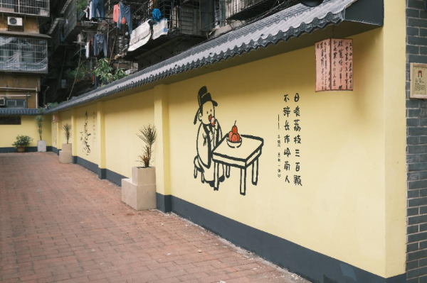 本次胜雨径提升亮点在于围墙改造,市城规公司设计团队以苏轼豁达的人生观为主题,将其自黄州、儋州到广州所作的诗句生成对应场景,通过简笔彩绘方式融入巷墙的设计中。每处转角对应一处场景,或是美食佳肴、或是人生感慨,让巷子成为可读、可感、可悟的文化长廊。墙顶覆以树脂瓦,墙身饰以黄漆,并嵌岭南特色窗花,于古寺意境中融入当代设计语言。