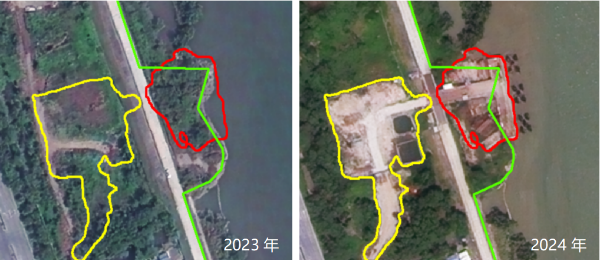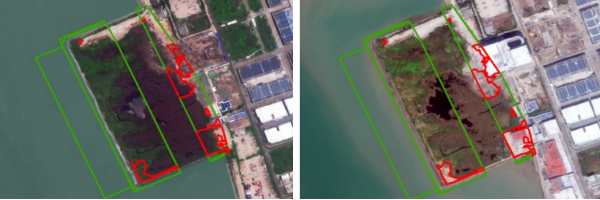 二是用海用岛项目“全过程透视镜”:推动监管模式从事后查处向过程防控转变。针对用海用岛项目监管中面临的“数量多、分布广、发现难”问题,遥感大模型提供了“批后-过程-成效”全链条智能化解决方案,通过将已批复项目范围图斑与全市最新年度遥感影像变化检测结果叠加比对,自动筛查超范围用海、擅自改变用途等违规风险,极大压缩了人工核查范围,使监管力量聚焦于“变化点”和“风险点”,推动用海监管从“事后查处”向“过程防控”升级。