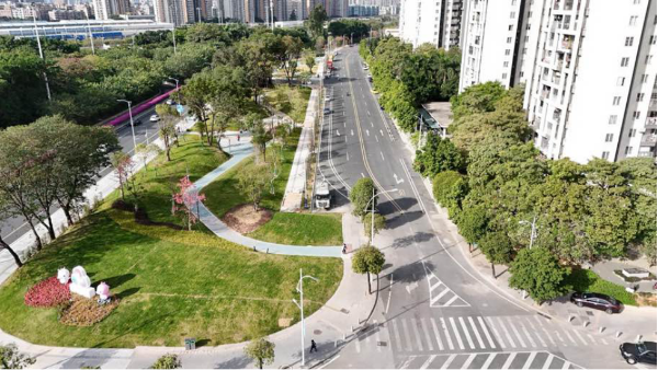 此前,天坤一路(原车陂西路)曾是“颜值”与“功能”均存在短板的典型路段:沿线工棚、厂房、砖房、停车场等设施杂乱分布,人车混行现象较为突出,通行效率不高。同时,照明设施缺失、积水扬尘等问题长期存在,存在一定的安全隐患,对周边小区、商场、学校群众的日常出行造成影响。如今道路通车焕新,道路机动车道、非机动车道、人行道“三线分明”,显著改善了通行安全与环境;同步落成的口袋公园,更成为城市公共空间的精致点缀,体现“方寸之地见匠心”的城市温度。作为天河智谷片区的标杆工程,天坤一路-棠陂路建设工程还承担了服务第十五届全国运动会的重要使命,天坤一路更是直通全运会主场馆的关键通道。