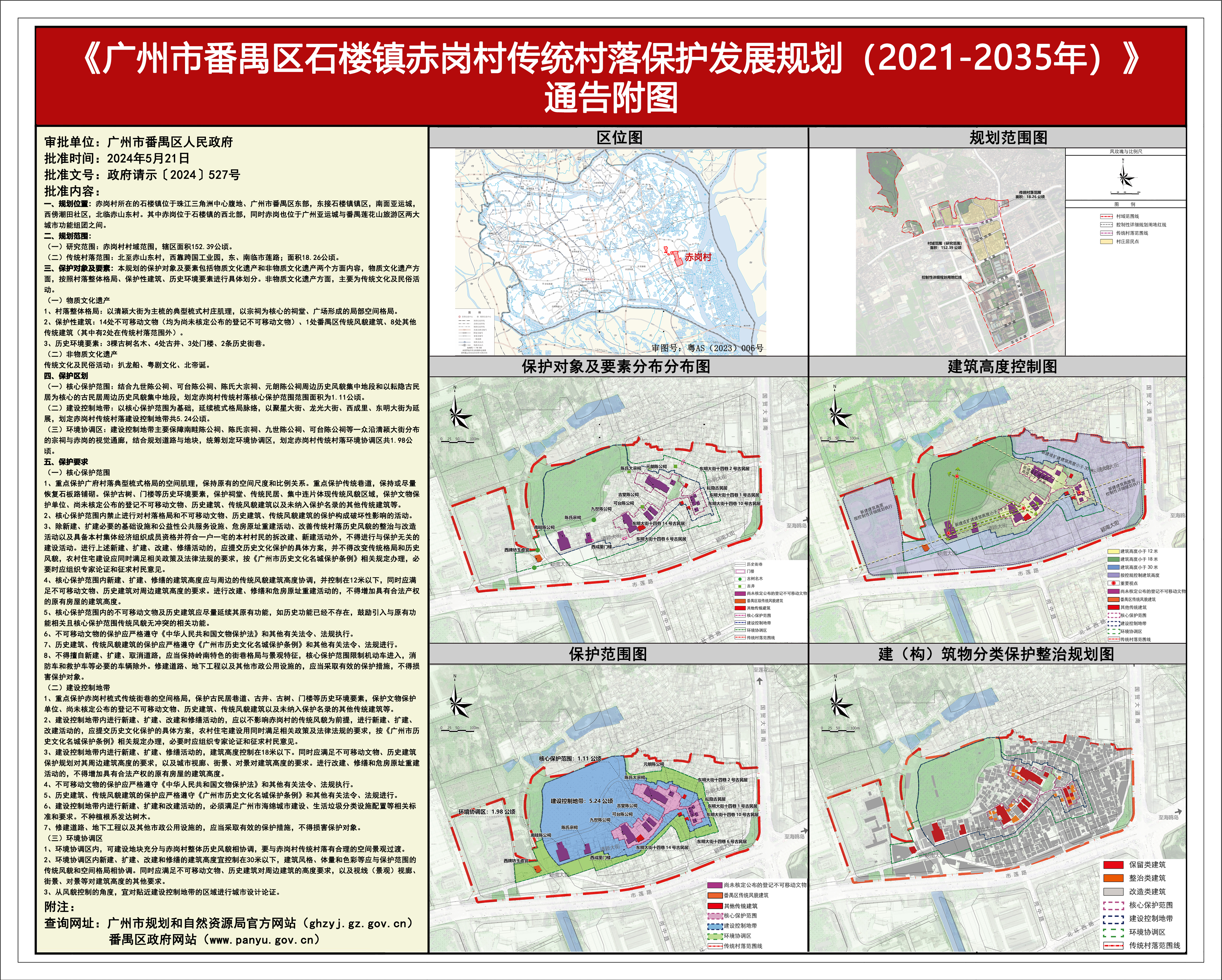 根据《中华人民共和国城乡规划法》、《广州市历史文化名城保护条例》等法律法规要求,《广州市番禺区石楼镇赤岗村传统村落保护发展规划(2021-2035年)》已完成征求意见、批前公示等程序,经番禺区人民政府批准实施(政府请示〔2024〕527号)。